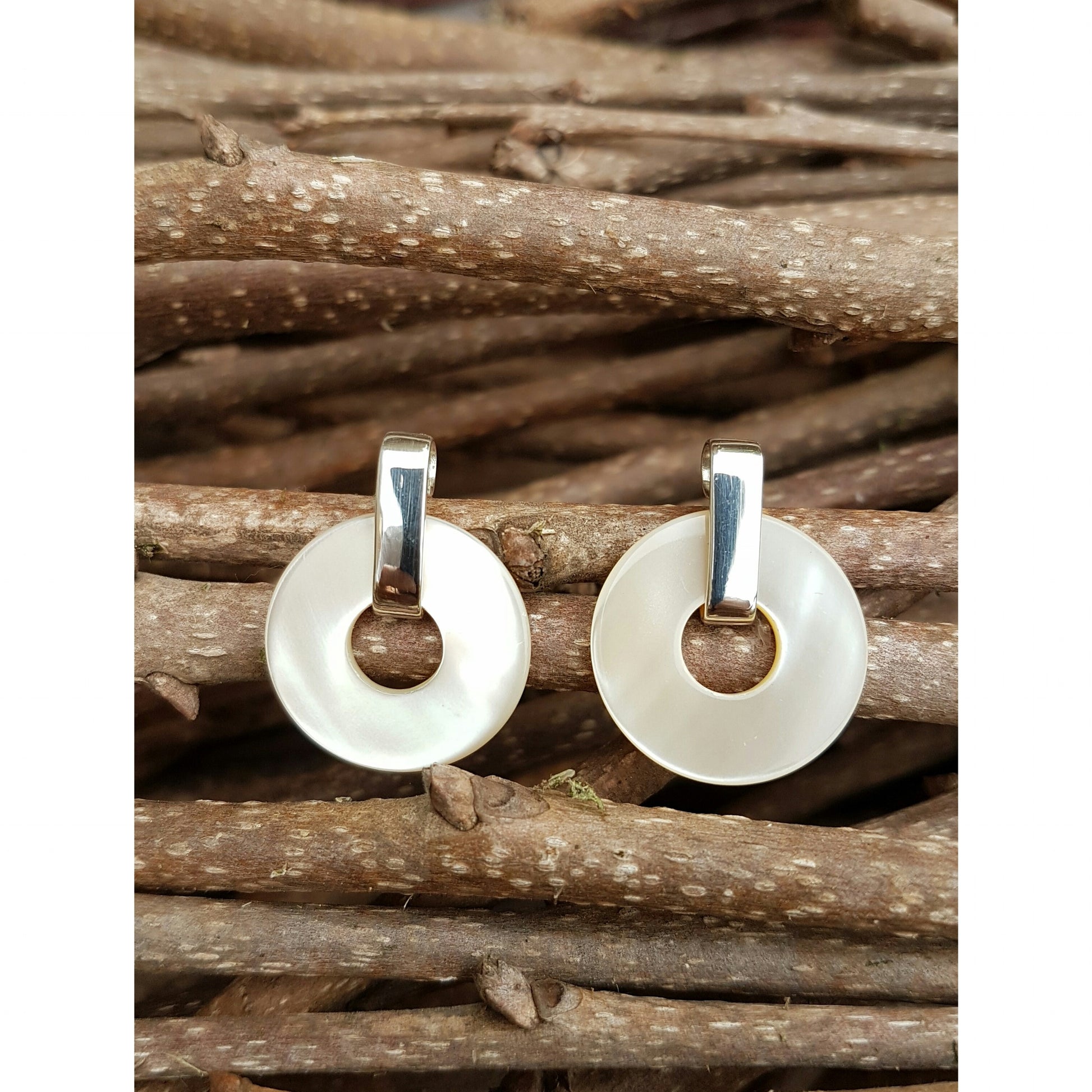 Pendiente plata y nacar, formado por un disco o donut nacar y una tira plata plana.
